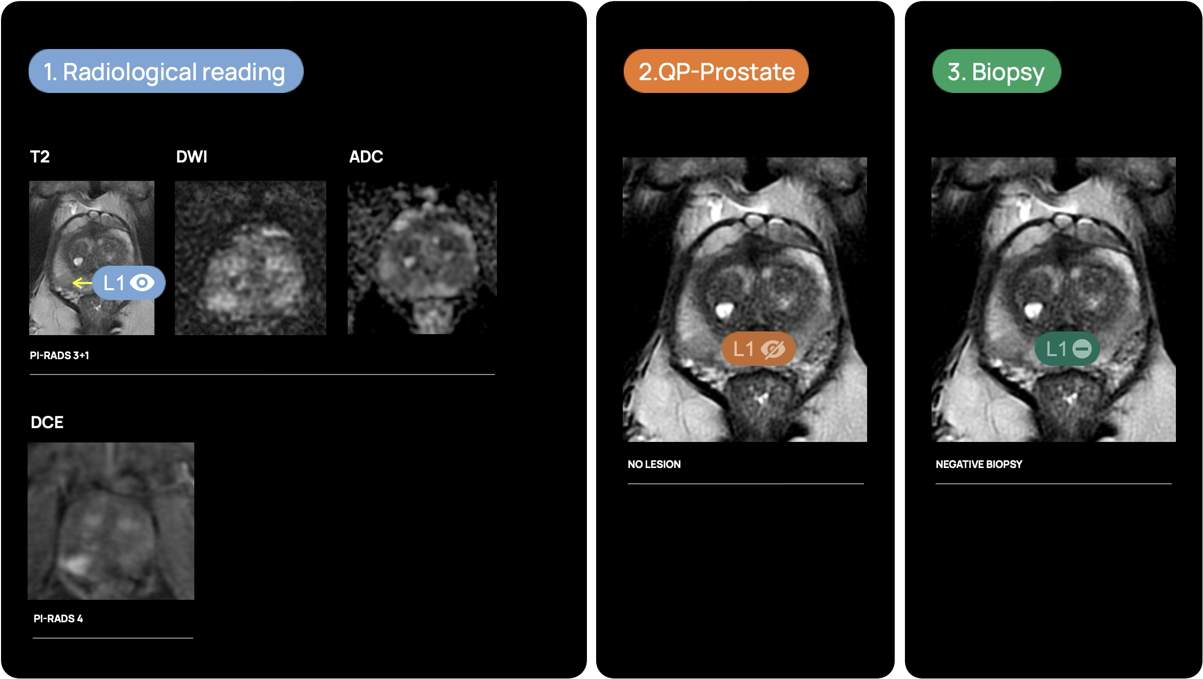 QP-Prostate automatically identifies and highlights prostate regions suspicious for aggressive prostate cancer, assigning each a confidence-based classification score.